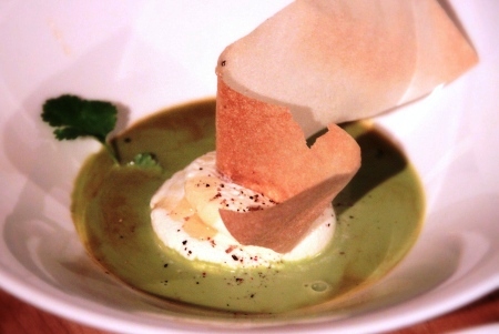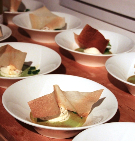 Mondate la rucola e l’insalata riccia e centrifugate il tutto. Al succo ottenuto unite qualche goccia di olio evo, 2 cucchiai di panna fresca, 2 di Fernet Branca, un pizzico di sale e amalgamate il tutto con l’aiuto di una forchetta. Il risultato sarà un mélange abbastanza amaro di color verde pistacchio. Ricavate dalle foglie di brick dei rettangoli e scaldatele in forno a 180° per il tempo necessario a farle colorare (circa 1 o 2 minuti). Con l’aiuto di una forchetta, montate il caprino unendo la panna restante fino ad ottenere un composto arioso simile ad una mousse. Dividete il restante Fernet Branca nei piatti, unite lentamente 1/4 dell’insalata liquida per ogni piatto e, con l’aiuto della sac a poche, versate nel centro del piatto il caprino. Finite il piatto colando sul formaggio un cucchiaio di miele, una spruzzata di pepe e decorate inserendo al centro la foglia di brick.