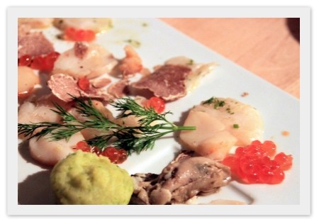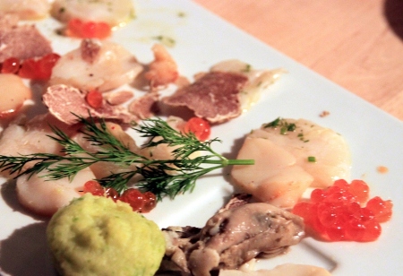insalata di mare, tartufo bianco e purea di cavoletti di bruxelles