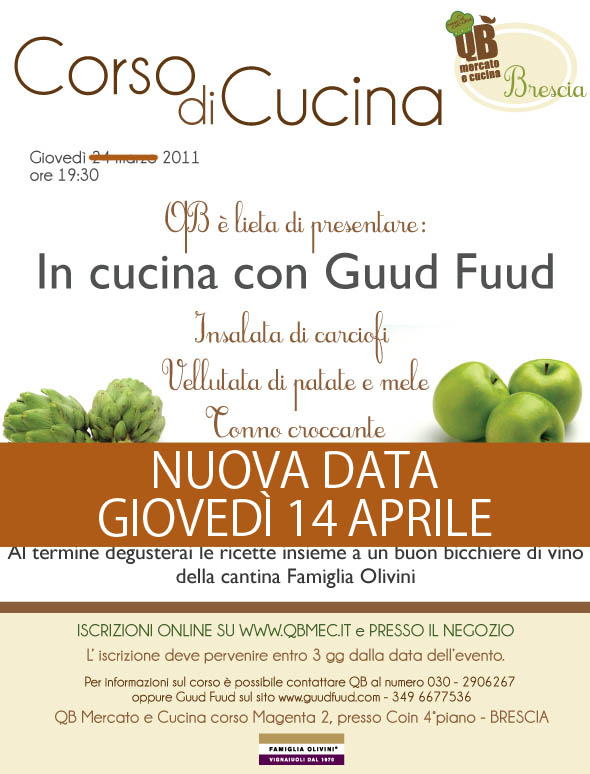 hehehe… questa cosa mi fa quasi venire i brividi :D… comunque è definitivo, il primo appuntamento in cucina con Guud Fuud si terrà il 14 aprile. Durante la serata prepareremo insieme i piatti del menu, discuteremo le tecniche di realizzazione e di cottura e alla fine ci magniamo tutto.