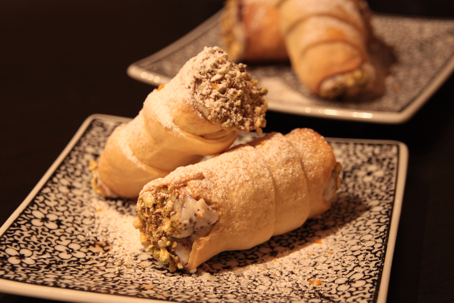 Aprite la confezione di pasta sfoglia e… (si, ok, avrei potuto farla direttamente io ma andavo un po’ di fretta) stendetela con un mattarello e tagliatela in strisce rettangolari di uguale dimensione. Stendere la pasta vi permetterà di renderete il cannolo più compatto e meno friabile (il gusto non cambia). Arrotolate le strisce sui coni  ben infarinati e mettete in forno a 170 gradi circa. In una ciotola mescolate la ricotta con lo zucchero, le scaglie di cioccolato, qualche pistacchio tritato e la scorza di un arancio. Lasciate riposare il composto. Quando i coni cotti si saranno raffreddati li potrete farcire aiutandovi con la sac a poche. Servite i cannoli decorandoli con un po’ di pistacchi tritati e una spruzzata di zucchero a velo.