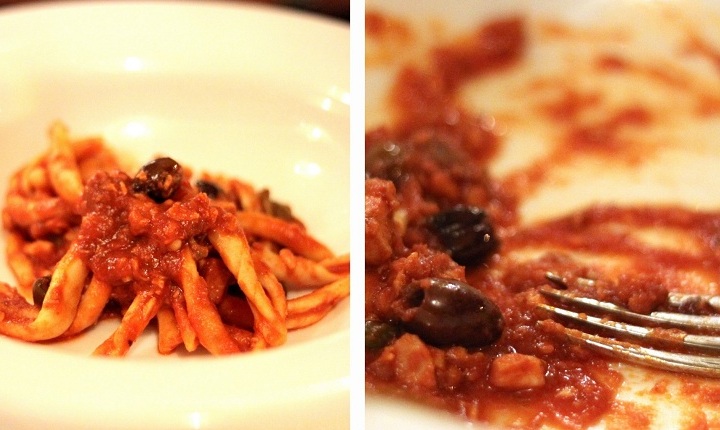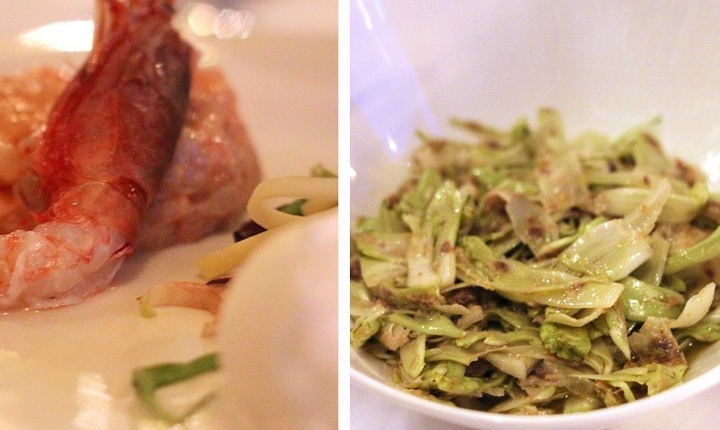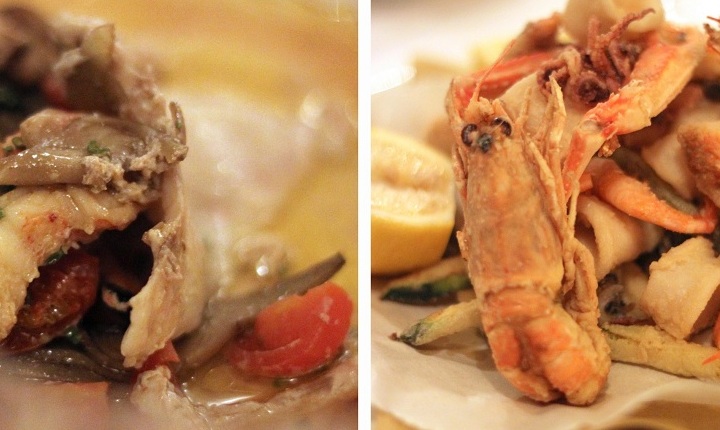 Veniamo alla serata. La bottiglia di vino che ha accompagnato la nostra cena è un ottimo bollicine Brut della Franciacorta, 100% Chardonnay, il Derbusco Cives Doppio Erre Di. Per antipasto ci siamo fatti servire una tartare di gambero rosso con gelato al limone. Buono il crostaceo ma troppo dolce per i miei gusti il gelato al limone. Non ho potuto resistere alle puntarelle, servite con acciughe e senape, tanto semplici quanto gustose. Come primi piatti, i tortelloni al nero di seppia ripieni di crostacei. Un bellissimo contrasto di colori per un piatto riuscito e molto delicato. E, decisamente più sapidi e mediterranei, gli strigoloni alla messinese. Il primo dei due secondi era un ottimo rombo chiodato, cotto al cartoccio, con carciofi, pomodorini, molluschi e crostacei. Il top della serata. A seguire un abbondantissimo fritto misto superleggero. Dopo una cena così il dolce proprio non ci stava ma alle coccole con il caffè non siamo riusciti a dire di no.